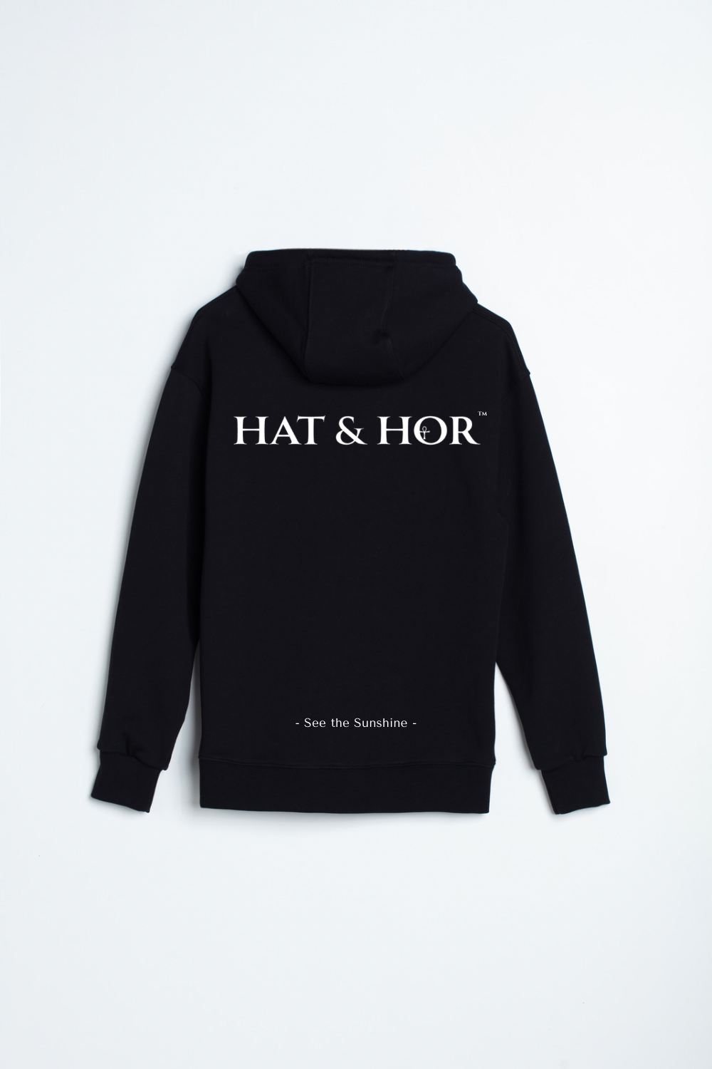 Step into sleek sophistication with our Classic Black Hoodie. Adorned with the iconic Hat&Hor™ label and intriguing back inscription, this hoodie exudes effortless style. The front hoodie pocket adds functionality to its captivating design.